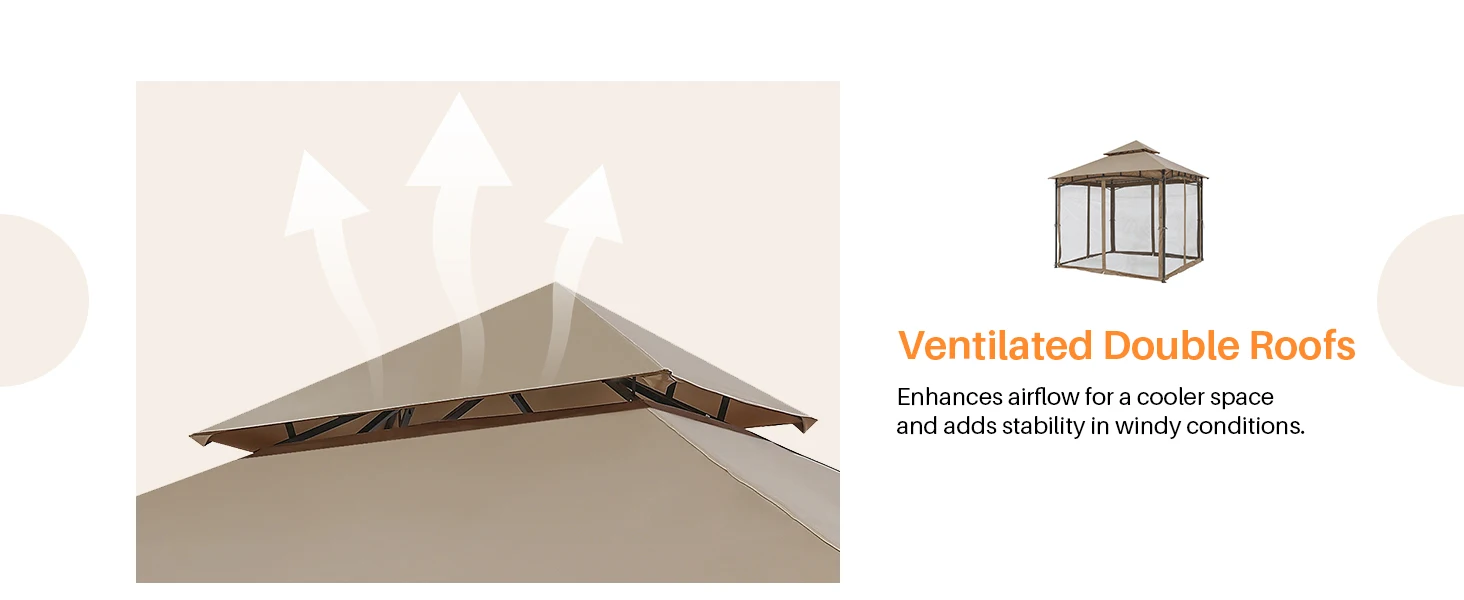 • Double-Tier Roof with Ventilation: The steeply pitched double-roof design allows for efficient airflow while minimizing wind stress—keeping your outdoor dining or relaxing experience cool, calm, and well-ventilated.