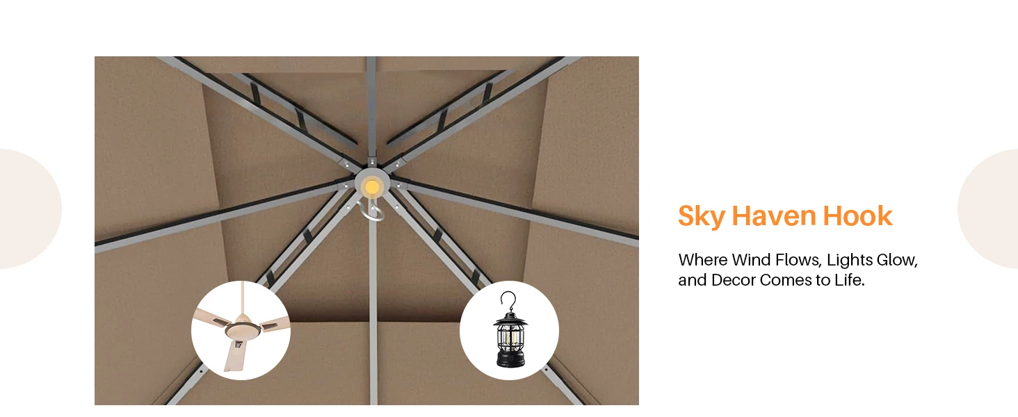 • All-Season Functionality & Elegant Finish: With built-in ceiling hooks for lights or fans and a neutral Sand Khaki top that pairs effortlessly with natural surroundings, this gazebo elevates every outdoor occasion—from backyard BBQs to evening garden receptions.