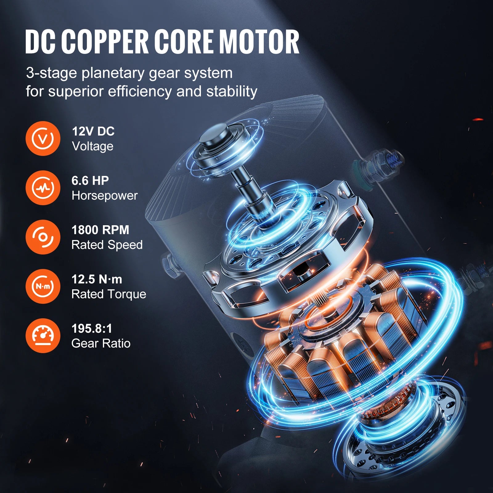 - 12V DC / 6.6 HP copper motor delivers consistent power output