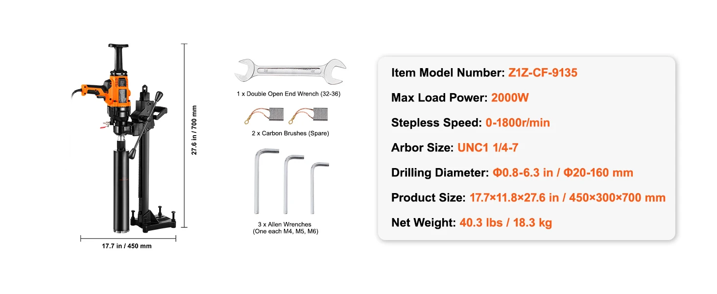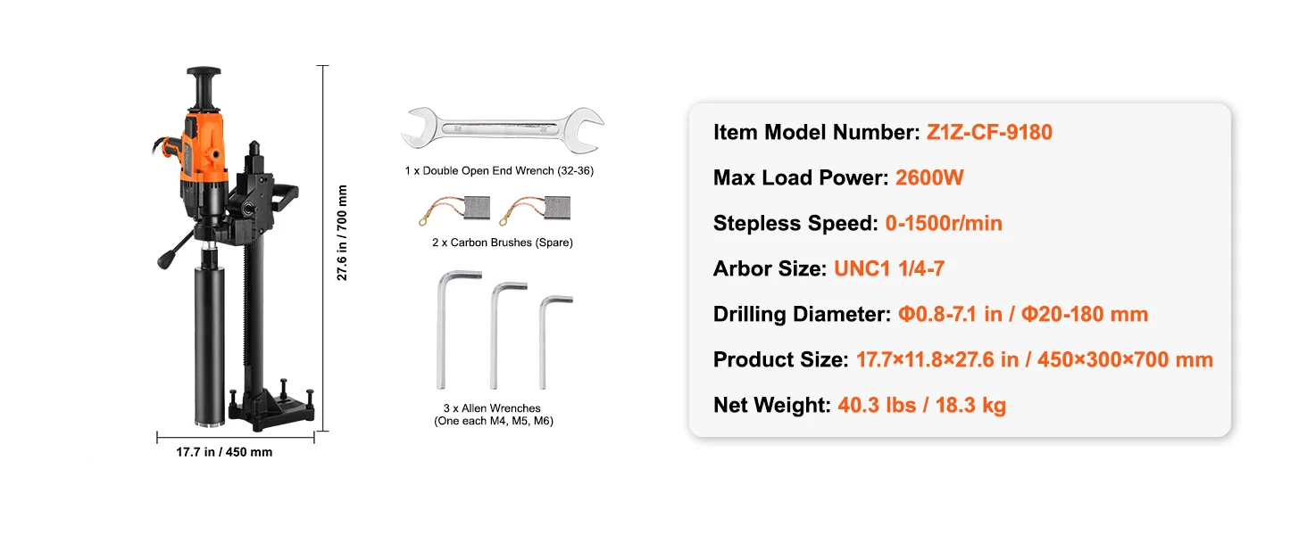 Powerful Core Drilling Efficiency: Equipped with a 2600W motor and adjustable speed, this core drill rig can handle hole sizes ranging from Φ0.8-7.1 in / Φ20-180 mm effortlessly. Whether drilling large or small holes, this tool ensures every task is efficient and precise.