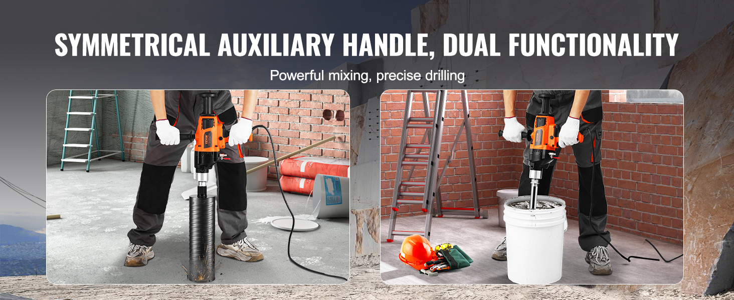 Versatile Multi-Function Use: Whether you need precise drilling or mixing cement, paint, or glue, this core drill machine handles it all with ease. The symmetrical auxiliary handle ensures comfort and stability, even during extended use. Quickly switch between different modes to meet a variety of construction needs.