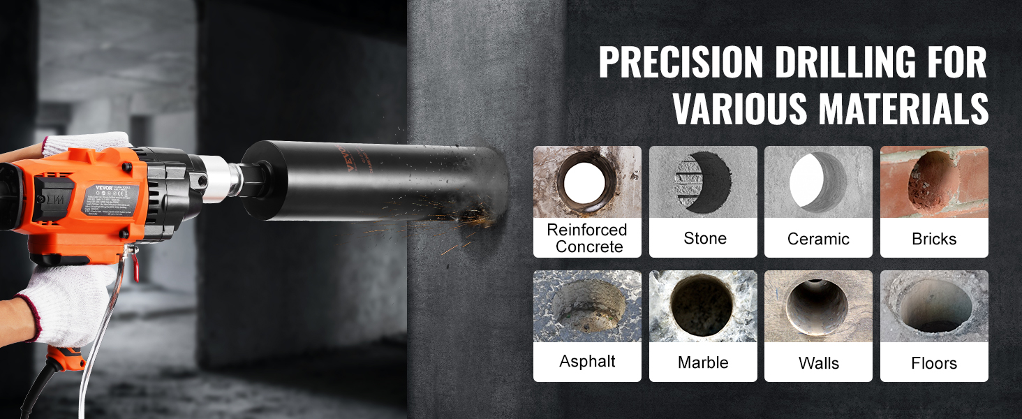 Engineered for Precision Drilling: The coring drill is designed for easy operation when drilling through reinforced concrete, red brick, marble, and more. It meets professional standards and is versatile enough for various tasks like installing air conditioners, kitchen pipes, stair railings, and even highway maintenance.