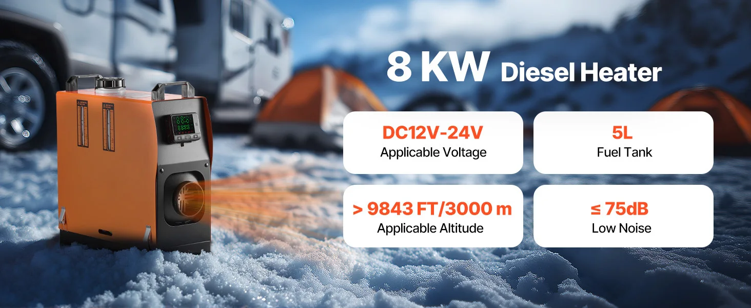 Conquer the cold with the powerful and efficient SucceBuy 8KW Diesel Heater, designed for a wide range of environments including RVs, trucks, boats, tool rooms, and indoor spaces. Powered by DC 12V or 24V, this compact unit is your perfect companion for winter journeys or stationary warmth.