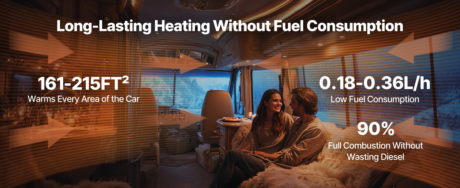 Low Fuel Consumption: With a precision low-noise fuel pump, the diesel air heater only consumes 1 gallon per night (0.18-0.36L/h). The 5L (1.3gal) large-capacity tank and ≥90% combustion efficiency maximize fuel use, reducing waste