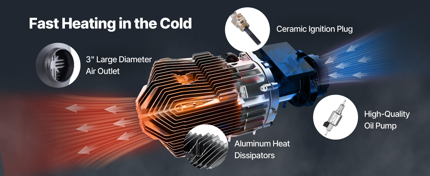 Easy Installation-free Solution: Enjoy efficient heating with our diesel heater all in one that requires no installation, making it perfect for outdoor adventures like camping. Heater Power: 8 KW; Rated Voltage: 12 V. Applicable Range: 215-269ft²/20-25m². Within just 10 minutes, our innovative sandblasting aluminum heat exchanger ensures rapid and efficient heat transfer, ensuring a comfortable temperature inside your vehicle, boat, or cabin.