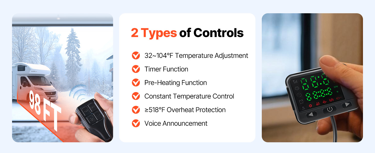 Dual Control Options: The portable diesel heater includes a 98ft remote control for preheating from outside the vehicle, keeping the interior warm and avoiding frost. The LCD screen allows for temperature adjustment between 32-104℉ to suit your needs