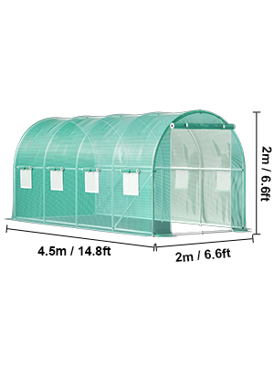 Size: 4.5 x 2 x 2 m/14.8 x 6.6 x 6.6 ft. Our tunnel greenhouse has a large storage space with one door and 8 mesh windows to increase air flow for plants to thrive.