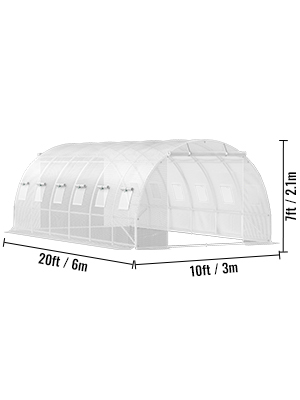 Size: 20 x 10 x 7 ft / 6.1 x 3 x 2.1 m. Our tunnel greenhouse has a large storage space with 2 doors and 12 mesh windows to increase air flow for plants to thrive.