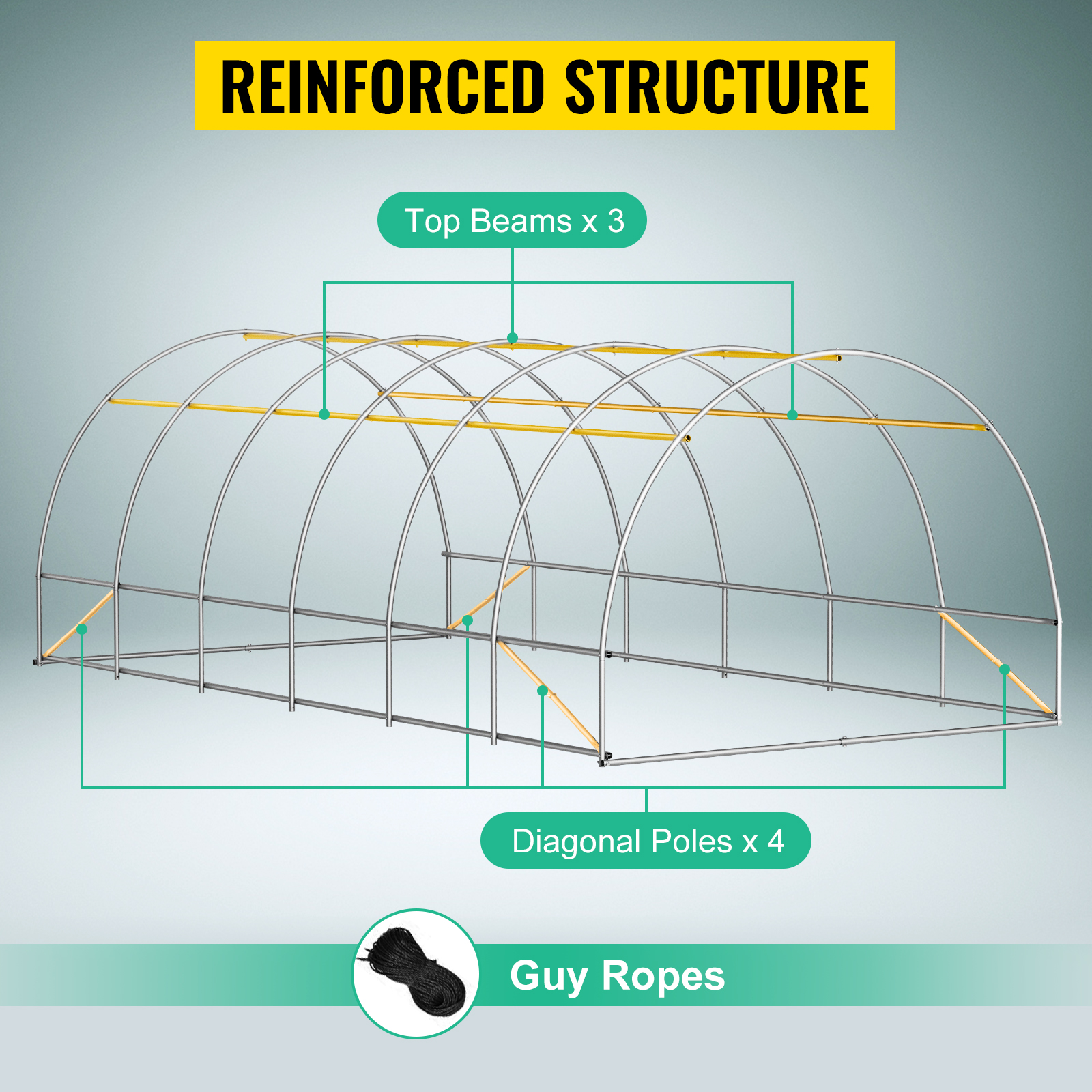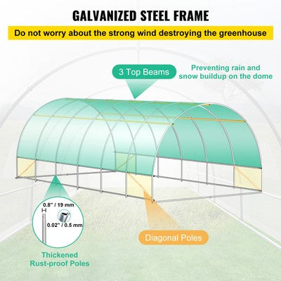 - Upgraded Galvanized Frame: We upgraded the galvanized steel to 0.8" diameter and 0.02" thickness. The 3 top beams with diagonal poles support a high tunnel greenhouse steadily. We have got you covered, so get ready to see your crops grow all year round.