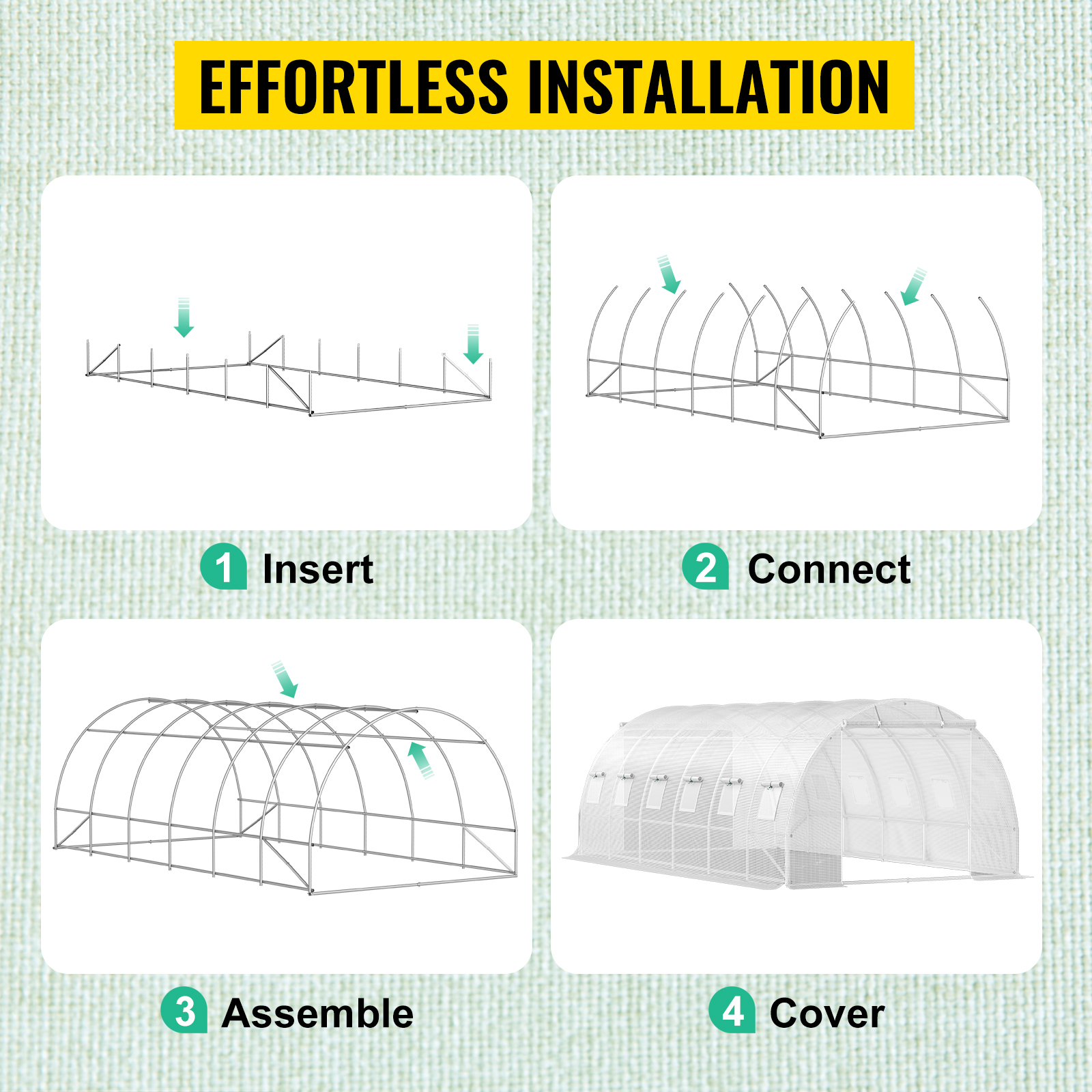 - All Tools Included: The hoop house greenhouse is easy to assemble with connectors, and screw covers can prevent scratches and rust.Includes 4 ropes, stakes, and guy ropes for added security, stability, and strength. Note: Do not tighten screws until the final position is confirmed.