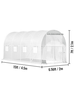 Size: 15 x 6.5 x 7 ft / 4.5 x 2 x 2.1 m. Our tunnel greenhouse has a large storage space with one door and 8 mesh windows to increase air flow for plants to thrive.