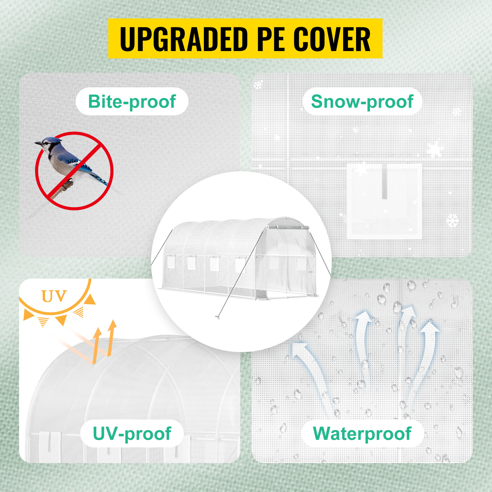 - High-Quality Waterproof PE: The walk-in tunnel greenhouse comes with a PE cover, which can protect your plants from ultraviolet rays, rust, snow, and rain all year round. The size of the cover fits the frame closely, enhancing the warmth and wind resistance in winter.