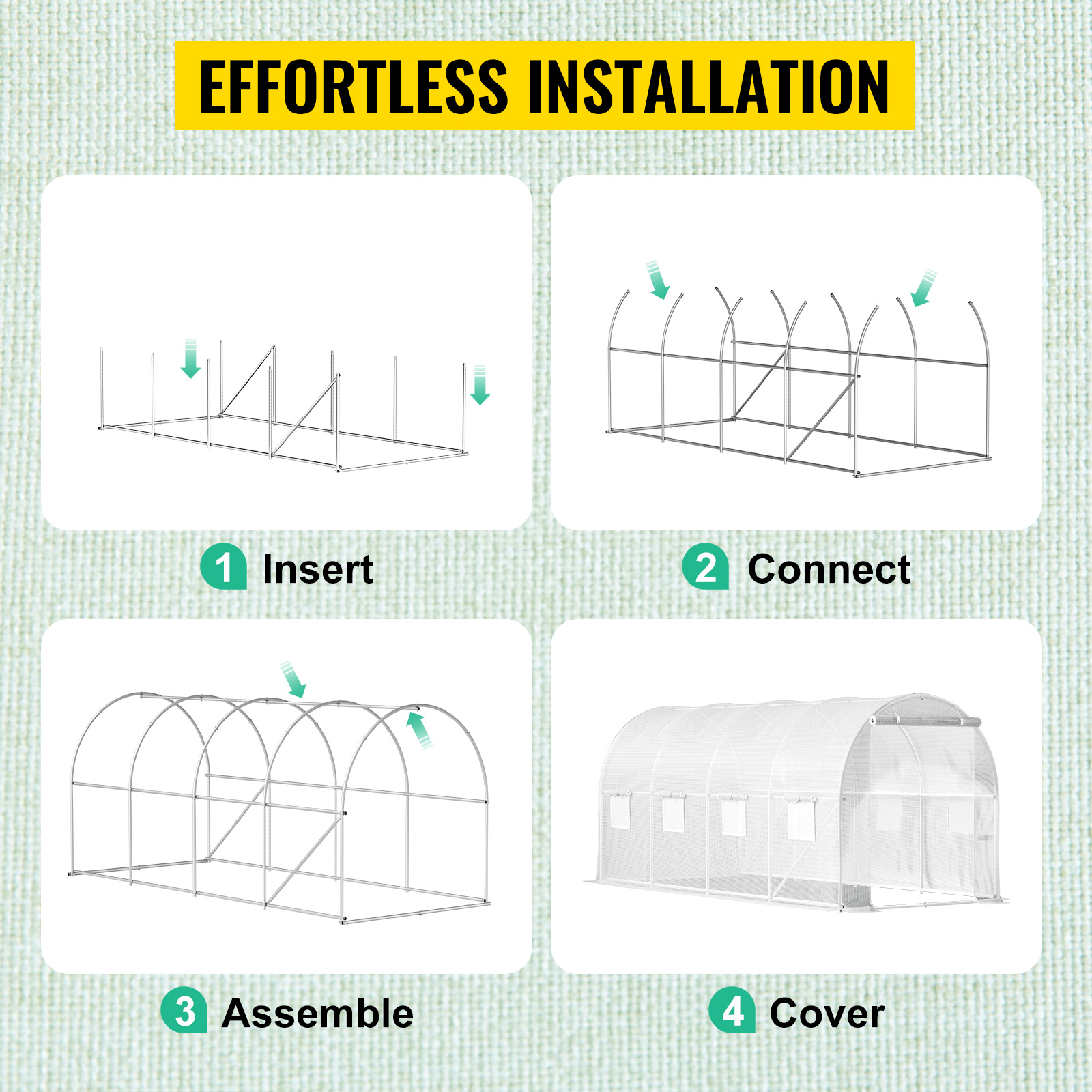 - All Tools Included: The hoop house greenhouse is easy to assemble with connectors, and screw covers can prevent scratches and rust.Includes 4 ropes, stakes, and guy ropes for added security, stability, and strength. Note: Do not tighten screws until the final position is confirmed.